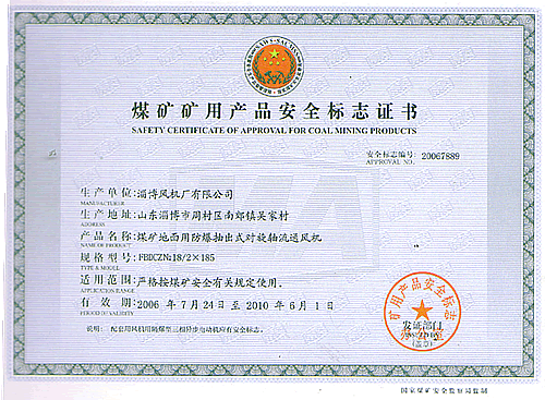 產品均獲機械部、煤炭部和煤科總院頒發的生產許可證、鑒定證書和MA安全標志。K系列礦用節能風機獲國家星火項目銀獎和冶金工業部科技進步二等獎、省科技成果一等獎等榮譽稱號。